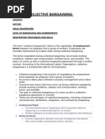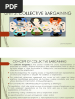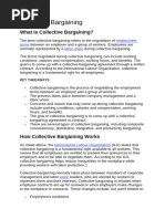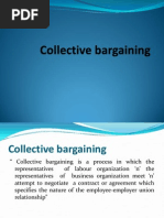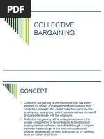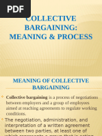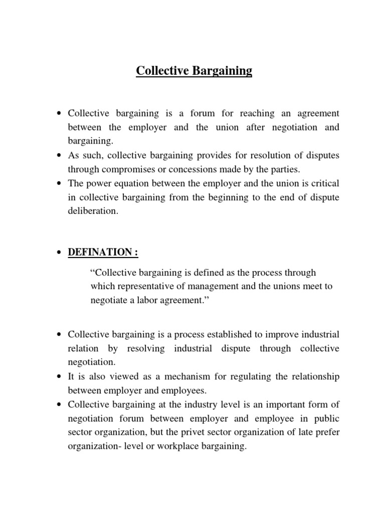 DEFINATION : Collective bargaining is defined as the process through which representative of management and the unions meet to negotiate a labor agreement. Collective bargaining is a process established to improve industrial relation by resolving industrial dispute through collective negotiation. It is also viewed as a mechanism for regulating the relationship between employer and employees. Collective bargaining at the industry level is an important form of negotiation forum between employer and employee in public sector organization, but the privet sector organization of late prefer organization- level or workplace bargaining.