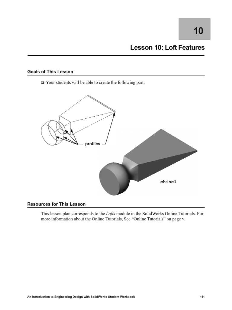 This lesson plan corresponds to the Lofts module in the SolidWorks Online Tutorials. For