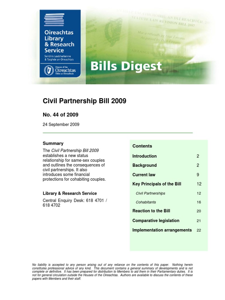 Civil Partnership Bills 2009 - Digest for Oireachtas Members