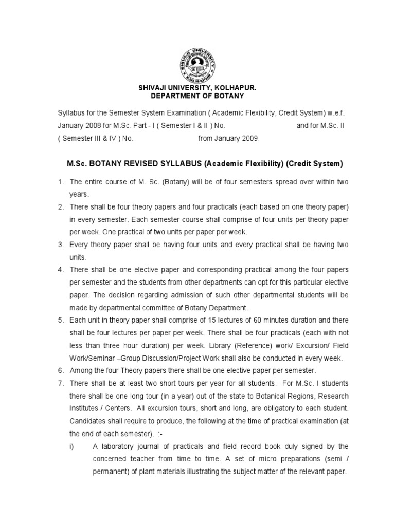DEPARTMENT OF BOTANY Syllabus for the Semester System Examination ( Academic Flexibility, Credit System) w.e.f. January 2008 for [Link]. Part - I ( Semester I & II ) No. ( Semester III & IV ) No. from January 2009. and for [Link]. II
