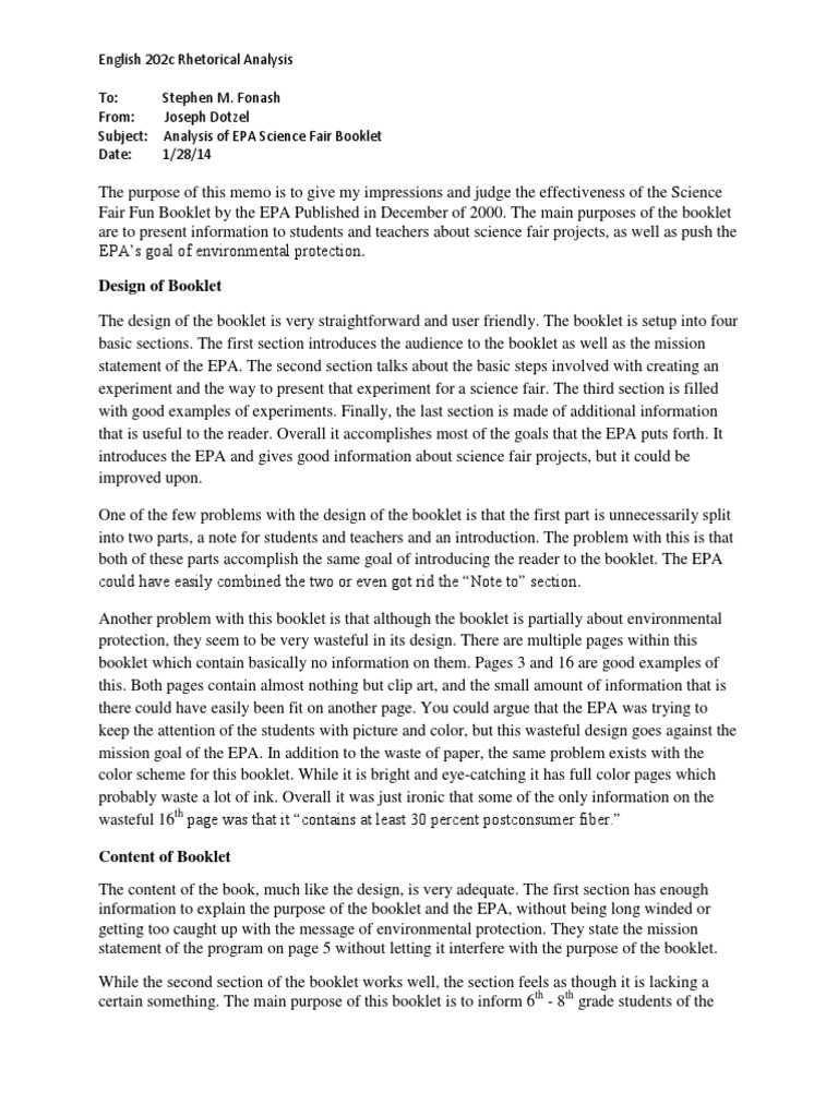 Fonash From: Joseph Dotzel Subject: Analysis of EPA Science Fair Booklet Date: 1/28/14