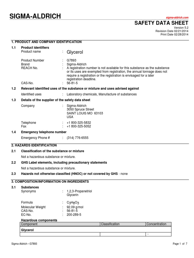 3. COMPOSITION/INFORMATION ON INGREDIENTS 3.1 Substances Synonyms : 1,2,3-Propanetriol Glycerin C3H8O3 92.09 g/mol 56-81-5 200-289-5 Classification Concentration Sigma-Aldrich - G7893 Page 1 of 7