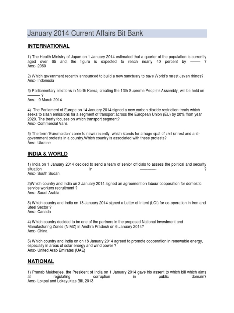 1) The Health Ministry of Japan on 1 January 2014 estimated that a quarter of the population is currently aged over 65 and the figure is expected to reach nearly 40 percent by ? Ans:- 2060 2) Which government recently announced to build a new sanctuary to save Worlds rarest Javan rhinos? Ans:- Indonesia 3) Parliamentary elections in North Korea, creating the 13th Supreme Peoples Assembly, will be held on - ? Ans:- 9 March 2014 4) The Parliament of Europe on 14 January 2014 signed a new carbon dioxide restriction treaty which seeks to slash emissions for a segment of transport across the European Union (EU) by 28% from year 2020. The treaty focuses on which transport segment? Ans:- Commercial Vans 5) The term Euromaidan came to news recently, which stands for a huge spat of civil un rest and antigovernment protests in a [Link] country is associated with these protests? Ans:- Ukraine
