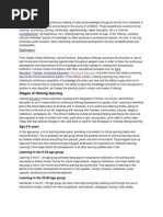both are concerned with conscious attempts to learn, selfeducation also carries with it a commitment to certain values like respect for others, the search for truth and so on. Self-directed learning need not. If we think in terms of the above model, then it can be seen that people might seek to teach themselves through conversation, through constructing some sort of learning plan, or by following programmes of learning constructed by others (for example, teaching themselves French via a language course on CD and book). Conclusion My basic line of argument here has been that once the obvious point is made that much learning takes place beyond the formal confines of the classroom, then the usefulness of the notion of informal learning quickly fades. Part of the reason for this has been the eagerness of policymakers, academics and practitioners to substitute the learning for education (lifelong learning rather than lifelong education; adult learning rather than adult education and so on see lifelong learning). A focus on learning is important, but when it is at a cost of thinking about education (and the values it carries), then a grievous disservice is done to all involved. Learning is a process that is happening all the time; education involves intention and