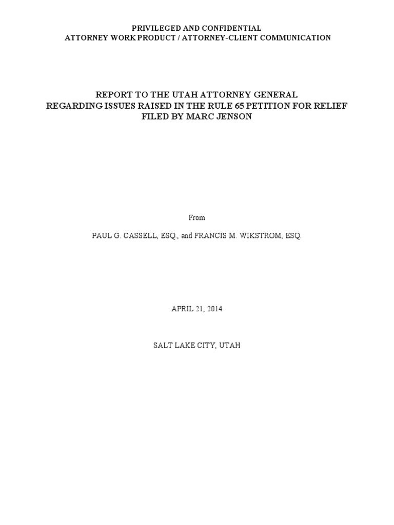 This report by former federal judge Paul Cassell and former federal prosecutor Francis Wikstrom was harshly critical of former Attorney General Mark Shurtleff's involvement in the fraud prosecution of Marc Jenson, saying Shurtleff's conduct in the case "defies explanation." At one point, senior attorneys in the office questioned if Shurtleff might be a "spy," intentionally leaking information to Jenson's defense team that might be damaging to the case.