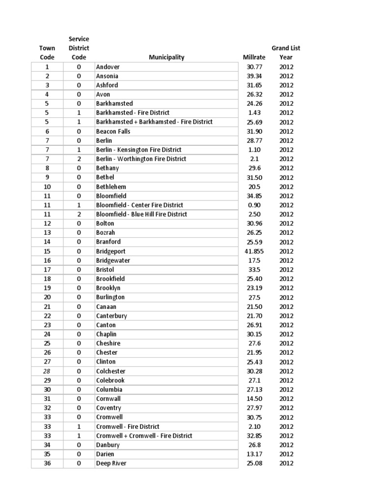 10Andover30.77201220Ansonia39.34201230Ashford31.65201240Avon26.32201250Barkhamsted24.26201251Barkhamsted - Fire District1.43201251Barkhamsted + Barkhamsted - Fire District25.69201260Beacon Falls31.90201270Berlin28.77201271Berlin - Kensington Fire District1.10201272Berlin - Worthington Fire District2.1201280Bethany29.6201290Bethel31.502012100Bethlehem20.52012110Bloomfield34.852012111Bloomfield - Center Fire District0.902012112Bloomfield - Blue Hill Fire District2.502012120Bolton30.962012130Bozrah26.252012140Branford25.592012150Bridgeport41.8552012160Bridgewater17.52012170Bristol33.52012180Brookfield25.402012190Brooklyn23.192012200Burlington27.52012210Canaan21.502012220Canterbury21.702012230Canton26.912012240Chaplin30.152012250Cheshire27.62012260Chester21.952012270Clinton25.432012