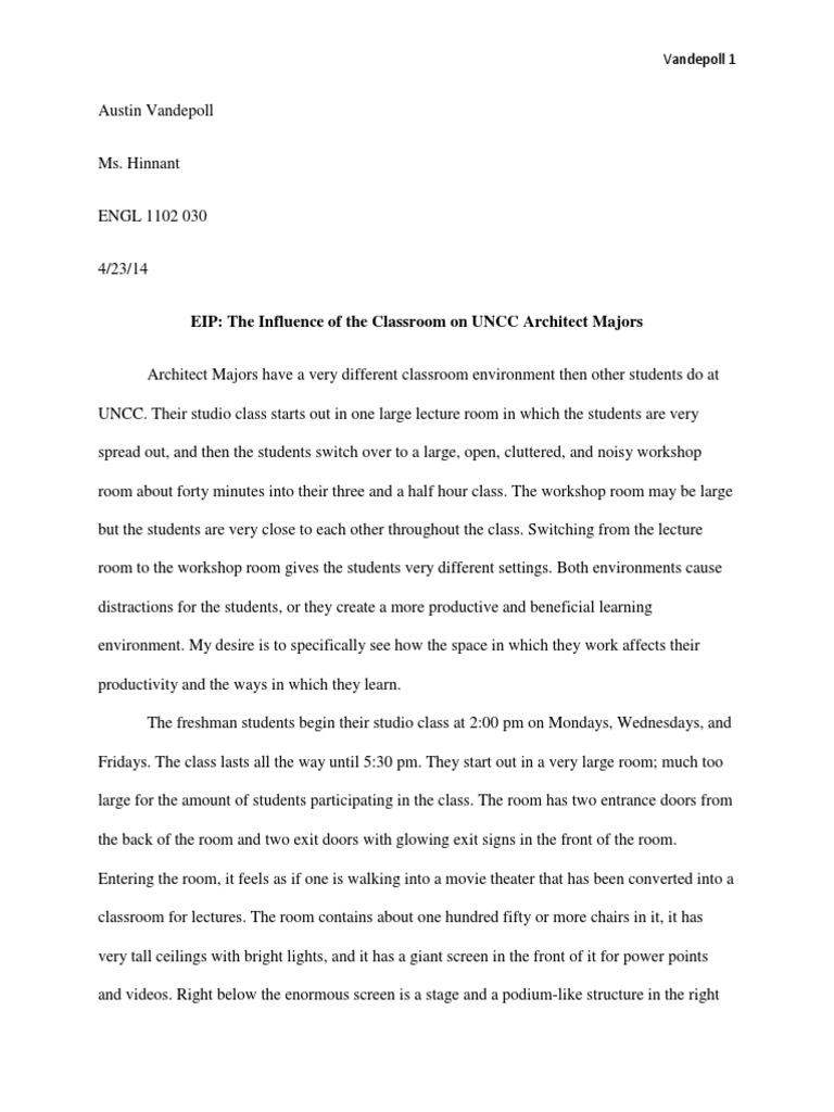 Austin Vandepoll Ms. Hinnant ENGL 1102 030 4/23/14 EIP: The Influence of the Classroom on UNCC Architect Majors Architect Majors have a very different classroom environment then other students do at UNCC. Their studio class starts out in one large lecture room in which the students are very spread out, and then the students switch over to a large, open, cluttered, and noisy workshop room about forty minutes into their three and a half hour class. The workshop room may be large but the students are very close to each other throughout the class. Switching from the lecture room to the workshop room gives the students very different settings. Both environments cause distractions for the students, or they create a more productive and beneficial learning environment. My desire is to specifically see how the space in which they work affects their productivity and the ways in which they learn. The freshman students begin their studio class at 2:00 pm on Mondays, Wednesdays, and Fridays. The class lasts all the way until 5:30 pm. They start out in a very large room; much too large for the amount of students participating in the class. The room has two entrance doors from the back of the room and two exit doors with glowing exit signs in the front of the room. Entering the room, it feels as if one is walking into a movie theater that has been converted into a classroom for lectures. The room contains about one hundred fifty or more chairs in it, it has very tall ceilings with bright lights, and it has a giant screen in the front of it for power points and videos. Right below the enormous screen is a stage and a podium-like structure in the right