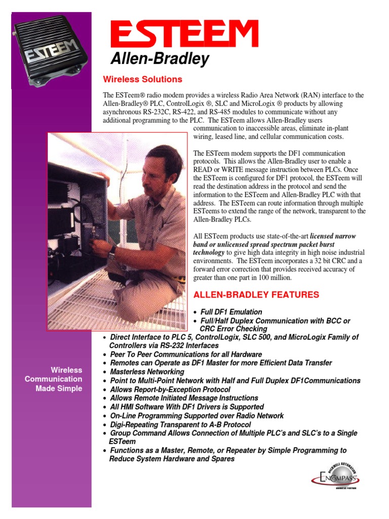 The ESTeem radio modem provides a wireless Radio Area Network (RAN) interface to the Allen-Bradley PLC, ControlLogix , SLC and MicroLogix products by allowing asynchronous RS-232C, RS-422, and RS-485 modules to communicate without any additional programming to the PLC. The ESTeem allows Allen-Bradley users communication to inaccessible areas, eliminate in-plant wiring, leased line, and cellular communication costs. The ESTeem modem supports the DF1 communication protocols. This allows the Allen-Bradley user to enable a READ or WRITE message instruction between PLCs. Once the ESTeem is configured for DF1 protocol, the ESTeem will read the destination address in the protocol and send the information to the ESTeem and Allen-Bradley PLC with that address. The ESTeem can route information through multiple ESTeems to extend the range of the network, transparent to the Allen-Bradley PLCs. All ESTeem products use state-of-the-art licensed narrow band or unlicensed spread spectrum packet burst technology to give high data integrity in high noise industrial environments. The ESTeem incorporates a 32 bit CRC and a forward error correction that provides received accuracy of greater than one part in 100 million.