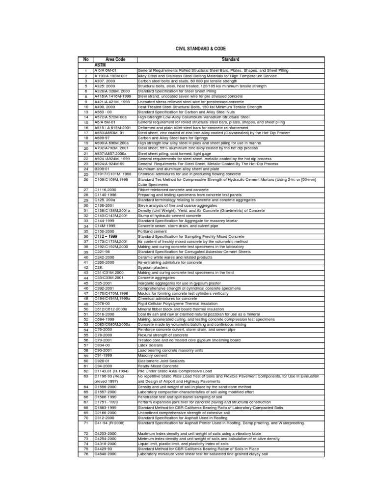 2000 A325: 2000 A328/A 328M, 2000 A416/A 1416M-1999 A421/A 421M, 1998 A490, 2000 A563 - 00 A572/A 572M-00a A6/A 6M-01 A615 / A 615M-2001 A653/A653M, 01 A689-97 A690/A 690M,200a A792/A792M, 2001 A857/A857,2000a A924 /A924M, 1999 A924/A 924M-99 B209-01 C1017/C101M, 1998 C109/C109M,1999 C1116,2000 C1140-1998 C125, 200a C136-2001 C138/C138M,2001a C143/C143M,2001 C144-1999 C14M-1999 C150-2000 C172 1999 C173/C173M,2001 C192/C192M,2000 C221-98 C242-2000 C260-2000 C28: C31/C31M,2000 C33/C33M,2001 C35-2001 C392-2001 C470/C470M,1998 C494/C494M,1999a C578-00 C612/C612-2000a C618-2000 C684-1999 C685/C685M,2000a C76-2000 C78-2000 C79-2001 C834-00 C90-2001 C91-1999 C920-01 C94-2000 D1143,81 (R-1994) D1196-93 (Reap proved 1997) D1556-2000 D1557-2000 D1586-1999 D1751--1999 D1883-1999 D2166-2000 D312-2000 D41-94 (R-2000) D4253-2000 D4254-2000 D4318-2000 D4429-93 D4648-2000 Standard General Requirements Rolled Structural Steel Bars, Plates, Shapes, and Sheet Piling Alloy-Steel and Stainless Steel Bolting Materials for High-Temperature Service Carbon steel bolts and studs, 60 000 psi tensile strength Structural bolts, steel, heat treated, 120/105 ksi minimum tensile strength Standard Specification for Steel Sheet Piling Steel strand, uncoated seven wire for pre stressed concrete Uncoated stress relieved steel wire for prestressed concrete Heat-Treated Steel Structural Bolts, 150 ksi Minimum Tensile Strength Standard Specification for Carbon and Alloy Steel Nuts High-Strength Low-Alloy Columbium-Vanadium Structural Steel General requirement for rolled structural steel bars, plates, shapes, and sheet piling Deformed and plain billet-steel bars for concrete reinforcement Steel sheet, zinc coated of zinc iron alloy coated (Galvanealed) by the Hot-Dip Procerr Carbon and Alloy Steel bars for Springs High strength low alloy steel H-piles and sheet piling for use in marine Steel sheet, 55% aluminium zinc alloy coated by the hot dip process Steel sheet piling, cold formed, light gage General requirements for steel sheet, metallic coated by the hot dip process General Requitments For Steel Sheet, Metalic-Coated By The Hot-Dip Process Aluminum and aluminum alloy sheet and plate Chemical admixtures for use in producing flowing concrete Standard Tes Method for Compressive Strength of Hydraulic Cement Mortars (Using 2-in. or [50-mm] Cube Specimens Fibber-reinforced concrete and concrete Preparing and testing specimens from concrete test panels Standard terminology relating to concrete and concrete aggregates Sieve analysis of fine and coarse aggregates Density (Unit Weight), Yield, and Air Concrete (Gravimetric) of Concrete Slump of hydraulic-cement concrete Standard Specification for Aggregate for masonry Mortar Concrete sewer, storm drain, and culvert pipe Portland cement Standard Specification for Sampling Freshly Mixed Concrete Air content of freshly mixed concrete by the volumetric method Making and curing concrete test specimens in the laboratory Standard Specification for Corrugated Asbestos-Cement Sheets Ceramic white wares and related products Air-entraining admixture for concrete Gypsum plasters Making and curing concrete test specimens in the field Concrete aggregates Inorganic aggregates for use in gypsum plaster Comprehensive strength of cylindrical concrete specimens Moulds for forming concrete test cylinders vertically Chemical admixtures for concrete Rigid Cellular Polystyrene Thermal Insulation Mineral fibber block and board thermal insulation Coal fly ash and raw or claimed natural pozzolan for use as a mineral Making, accelerated curing, and testing concrete compression test specimens Concrete made by volumetric batching and continuous mixing Reinforce concrete culvert, storm drain, and sewer pipe Flexural strength of concrete Treated core and no treated core gypsum sheathing board Latex Sealans Load bearing concrete masonry units Masonry cement Elastomeric Joint Sealants Ready-Mixed Concrete Pile Under Static Axial Compressive Load No repetitive Static Plate Load Test of Soils and Flexible Pavement Components, for Use in Evaluation and Design of Airport and Highway Pavements Density and unit weight of soil in place by the sand-cone method Laboratory compaction characteristics of soil using modified effort Penetration test and split-barrel sampling of soil Perform expansion joint filler for concrete paving and structural construction Standard Method for CBR California Bearing Ratio of Laboratory-Compacted Soils Unconfined comprehensive strength of cohesive soil Standard Specification for Asphalt Used in Roofing Standard Specification for Asphalt Primer Used in Roofing, Damp proofing, and Waterproofing. Maximum index density and unit weight of soils using a vibratory table Minimum index density and unit weight of soils and calculation of relative density Liquid limit, plastic limit, and plasticity index of soils Standard Method for CBR California Bearing Ration of Soils in Place Laboratory miniature vane shear test for saturated fine-grained clayey soil