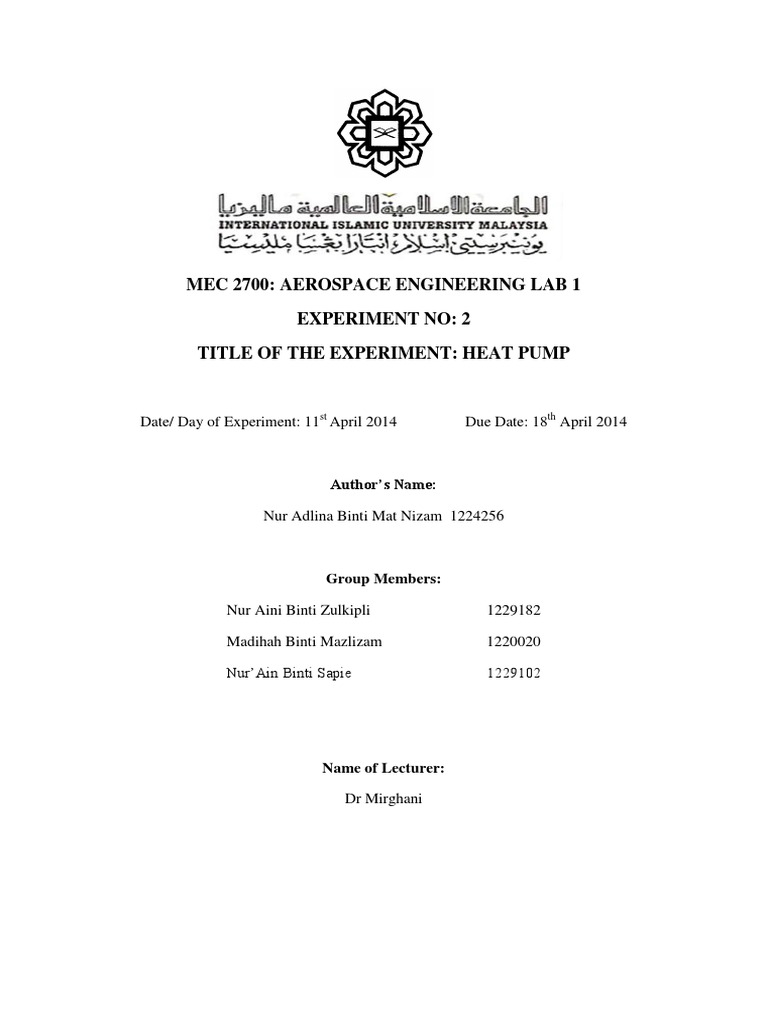 MEC 2700: AEROSPACE ENGINEERING LAB 1 EXPERIMENT NO: 2 TITLE OF THE EXPERIMENT: HEAT PUMP