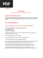 OBJECTIVE Water heat pump: To measure pressure and temperature in the circuit and in the water reservoirs on the condenser side and the vaporizer side alternately. To calculate energy taken up and released, also the volume concentration in the circuit and the volumetric efficiency of the compressor. Air-water heat pump: To measure vaporizer temperature and water bath temperature on the condenser side under different operating conditions on the vaporizer side, ie. natural air, cold blower and hot blower. To determine the electric power consumed by the compressor and calculate the coefficient of performance.