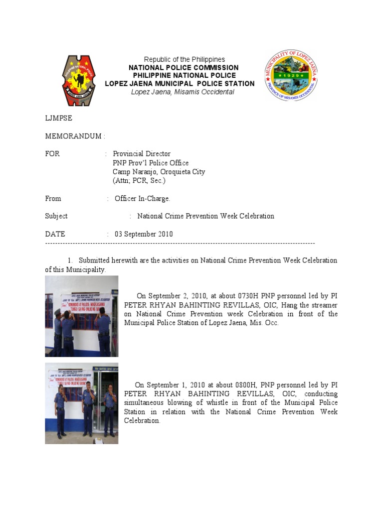 DA/E : 01 Septem,er 2030 )))))))))))))))))))))))))))))))))))))))))))))))))))))))))))))))))))))))))))))))))))))))))))))))))))))))))))) 3& S",mitte4 *ere5it* are t*e activitie6 on National Crime Prevention -ee. Cele,ration of t*i6 M"nicipalit#& On Septem,er 2 2030 at a,o"t 07108 PNP per6onnel le4 ,# P( PE/ER R89AN :A8(N/(N; RE<(LLAS O(C 8an+ t*e 6treamer on National Crime Prevention 5ee. Cele,ration in front of t*e M"nicipal Police Station of Lope= Jaena Mi6& Occ&