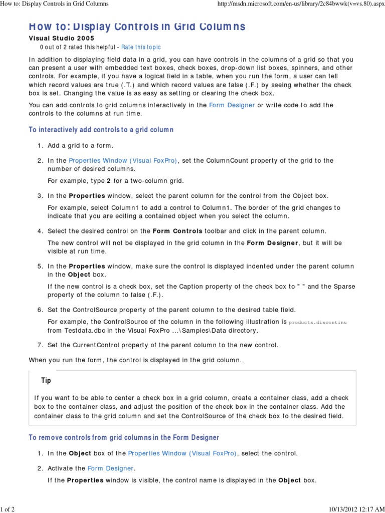 Visual Studio 2005 0 out of 2 rated this helpful - Rate this topic In addition to displaying field data in a grid, you can have controls in the columns of a grid so that you can present a user with embedded text boxes, check boxes, drop-down list boxes, spinners, and other controls. For example, if you have a logical field in a table, when you run the form, a user can tell which record values are true (.T.) and which record values are false (.F.) by seeing whether the check box is set. Changing the value is as easy as setting or clearing the check box. You can add controls to grid columns interactively in the Form Designer or write code to add the controls to the columns at run time.