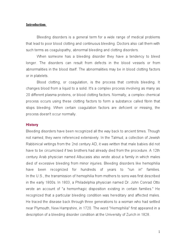 and continuous bleeding. Doctors also call them with such terms as coagulopathy, abnormal bleeding and clotting disorders. When someone has a bleeding disorder they have a tendency to bleed longer. The disorders can result from defects in the blood vessels or from abnormalities in the blood itself. The abnormalities may be in blood clotting factors or in platelets. Blood clotting, or coagulation, is the process that controls bleeding. It changes blood from a liquid to a solid. It's a comple process involving as many as !" different plasma proteins, or blood clotting factors. #ormally, a comple chemical process occurs using these clotting factors to form a substance called fibrin that stops bleeding. When certain coagulation factors are deficient or missing, the process doesn't occur normally. History Bleeding disorders have been recogni$ed all the way bac% to ancient times. Though not named, they were referenced e tensively. In the Talmud, a collection of &ewish 'abbinical writings from the !nd century (D, it was written that male babies did not have to be circumcised if two brothers had already died from the procedure. ( )!th century (rab physician named (lbucasis also wrote about a family in which males died of e cessive bleeding from minor in*uries. Bleeding disorders li%e hemophilia have been recogni$ed for hundreds of years to +run in+ families. In the ,.-., the transmission of hemophilia from mothers to sons was first described in the early ).""s. In )."/, a 0hiladelphia physician named Dr. &ohn 1onrad 2tto wrote an account of +a hemorrhagic disposition e isting in certain families.+ 3e recogni$ed that a particular bleeding condition was hereditary and affected males. 3e traced the disease bac% through three generations to a woman who had settled near 0lymouth, #ew 3ampshire, in )4!". The word +3emophilia+ first appeared in a description of a bleeding disorder condition at the ,niversity of 5urich in ).!..