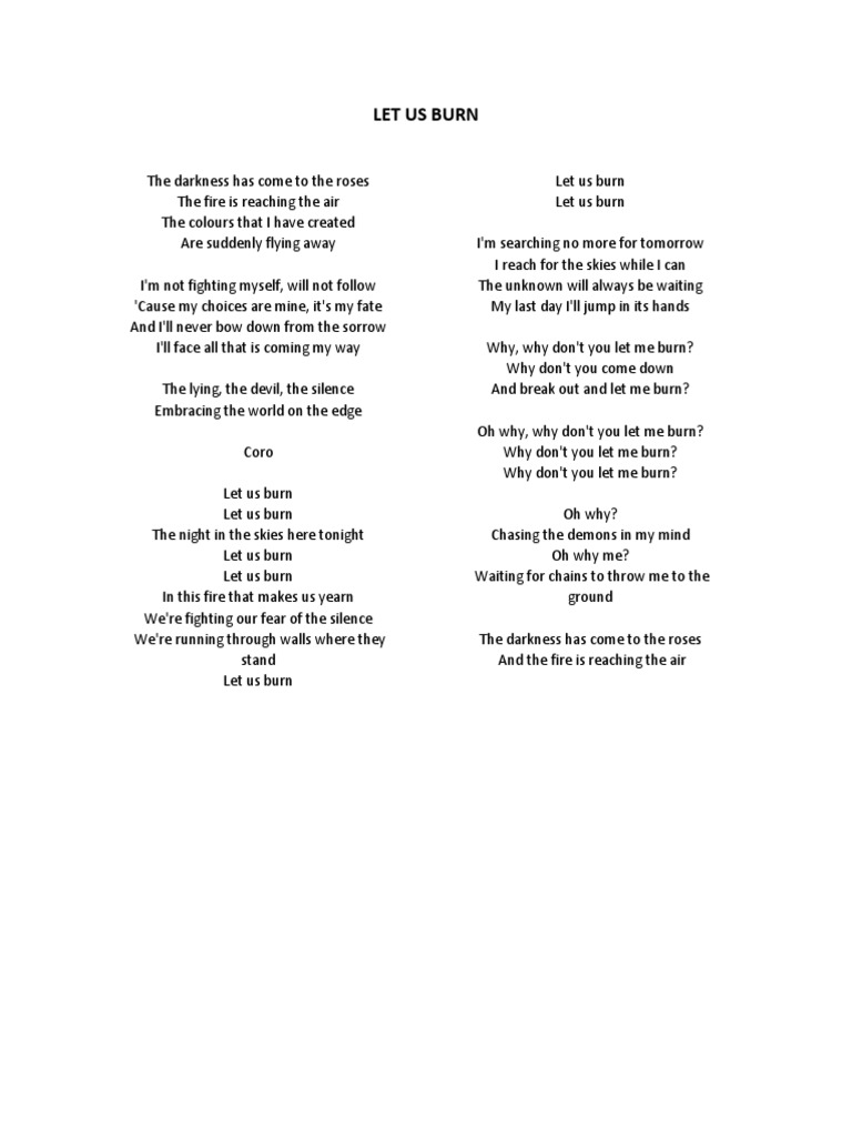 The darkness has come to the roses The fire is reaching the air The colours that I have created Are suddenly flying away I'm not fighting myself, will not follow 'Cause my choices are mine, it's my fate And I'll never bow down from the sorrow I'll face all that is coming my way The lying, the devil, the silence Embracing the world on the edge Coro Let us burn Let us burn The night in the skies here tonight Let us burn Let us burn In this fire that makes us yearn We're fighting our fear of the silence We're running through walls where they stand Let us burn Let us burn Let us burn I'm searching no more for tomorrow I reach for the skies while I can The unknown will always be waiting My last day I'll jump in its hands Why, why don't you let me burn? Why don't you come down And break out and let me burn? Oh why, why don't you let me burn? Why don't you let me burn? Why don't you let me burn? Oh why? Chasing the demons in my mind Oh why me? Waiting for chains to throw me to the ground The darkness has come to the roses And the fire is reaching the air