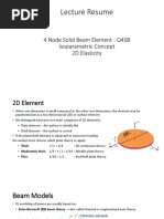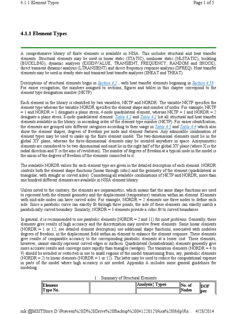 A comprehensive library of finite elements is available in NISA. This includes structural and heat transfer elements. Structural elements may be used in linear static (STATIC), nonlinear static (NLSTATIC), buc lin! ("#C$LIN%), dynamic analyses (&I%&N'AL#&, T(ANSI&NT, )(&*#&NC+, (AN,-. and S/-C$), direct transient dynamic analysis (LT(ANSI&NT) and direct fre0uency response analysis (,)(&*). /eat transfer elements may be used in steady state and transient heat transfer analyses (S/&AT and T/&AT). ,escriptions of structural elements be!in in Section 4.2 , 1ith heat transfer elements be!innin! in Section 4.39 . )or easier reco!nition, the numbers assi!ned to sections, fi!ures and tables in this chapter correspond to the element type desi!nation number (N$T2). &ach element in the library is identified by t1o variables, N$T2 and N-(,(. The variable N$T2 specifies the element type 1hereas the variable N-(,( specifies the element shape and number of nodes. )or e3ample, N$T2 4 5 and N-(,( 4 5 desi!nate a plane stress, 67node 0uadrilateral element, 1hereas N$T2 4 5 and N-(,( 4 8 desi!nate a plane stress, 97node 0uadrilateral element. Table 4.1 and Table 4.2 list all structural and heat transfer elements available in the library, in ascendin! order of the element type number (N$T2). )or easier identification, the elements are !rouped into different cate!ories accordin! to their usa!e in Table 4.3 and Table 4.4 1hich also sho1 the element shapes, de!rees of freedom per node and element features. Any admissible combination of element types may be used to ma e up the finite element model. The t1o7dimensional elements must lie in the !lobal :+ plane, 1hereas the three7dimensional elements may be oriented any1here in space. A3isymmetric elements are considered to be t1o7dimensional and must lie in the ri!ht half of the !lobal :+ plane (1here : is the radial direction and + is the a3is of revolution). The number of de!rees of freedom at a typical node in the model is the union of the de!rees of freedom of the elements connected to it. The available N-(,( values for each element type are !iven in the detailed description of each element. N-(,( controls both the element shape functions (linear throu!h cubic) and the !eometry of the element (0uadrilateral or trian!ular, 1ith strai!ht or curved sides). Considerin! all available combinations of N$T2 and N-(,(, more than one hundred different elements are available in NISA element library. #nless noted to the contrary, the elements are isoparametric, 1hich means that the same shape functions are used to represent both the element !eometry and the displacement (temperature) variation 1ithin an element. &lements 1ith mid7side nodes can have curved sides. )or e3ample, N-(,( 4 8 elements use three nodes to define each side. Since a parabolic curve can e3actly fit throu!h three points, the side of these elements can e3actly match a parabolically curved boundary. Similarly, N-(,( 4 ; elements provide a cubic fit to curved boundaries. In !eneral, it is recommended to use parabolic elements (N-(,( 4 8 and 55) for most problems. %enerally, these elements !ive results of hi!h accuracy and the discreti<ation may involve fe1er elements. Some linear elements (N-(,( 4 5 or 58, see detailed element description) use additional shape functions, associated 1ith nodeless de!rees of freedom, in the displacement field 1ithin an element to enhance the element response. These elements !ive results of comparable accuracy to the correspondin! parabolic elements at a lesser cost. These elements, ho1ever, cannot e3actly represent curved ed!es or surfaces. *uadrilateral (he3ahedronal) elements !enerally !ive more accurate results and conver!e more rapidly than trian!les (1ed!es). The transition elements (N-(,( 4 6 to =) should be avoided or restricted in use to small re!ions of the model transitionin! from, say, parabolic elements (N-(,( 4 8) to linear elements (N-(,( 4 5 or 58). The latter may be used to reduce the computational e3pense in parts of the model 1here hi!h accuracy is not needed. Appendi3 A includes some !eneral !uidelines for modelin!. 5. Summary of Structural &lements Analysis Types