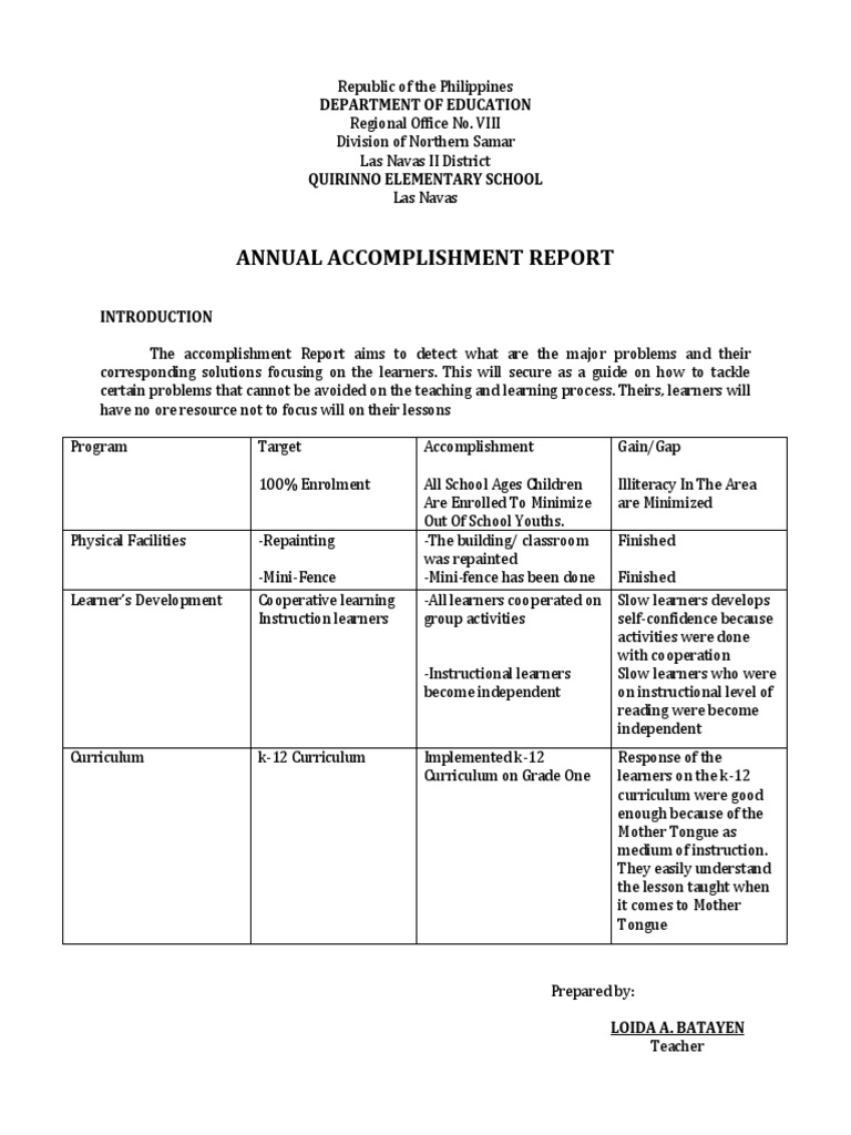 INTRODUCTION The accomplishment Report aims to detect what are the major problems and their corresponding solutions focusing on the learners. This will secure as a guide on how to tackle certain problems that cannot be avoided on the teaching and learning process. Theirs, learners will have no ore resource not to focus will on their lessons Program Target 100% Enrolment Physical Facilities -Repainting -Mini-Fence Cooperative learning Instruction learners Accomplishment All School Ages Children Are Enrolled To Minimize Out Of School Youths. -The building/ classroom was repainted -Mini-fence has been done -All learners cooperated on group activities -Instructional learners become independent Gain/Gap Illiteracy In The Area are Minimized Finished Finished Slow learners develops self-confidence because activities were done with cooperation Slow learners who were on instructional level of reading were become independent Response of the learners on the k-12 curriculum were good enough because of the Mother Tongue as medium of instruction. They easily understand the lesson taught when it comes to Mother Tongue
