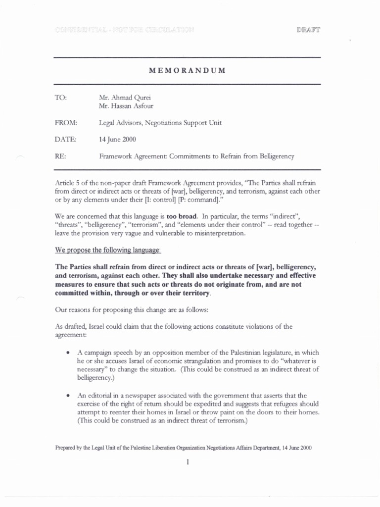 Mr. Ahmad Qurei Mr. Hassan Asfour Legal Advisors, Negotiations Support Unit 14 June 2000 Framework Agreement: Commitments to Refrain from Belligerency