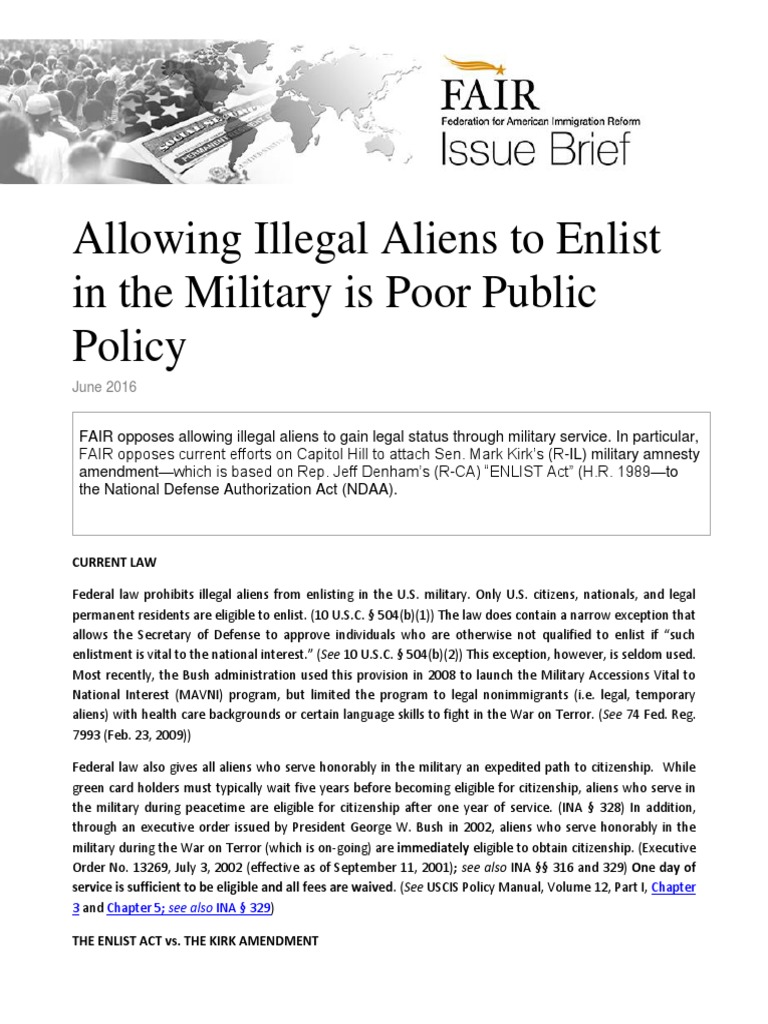 FAIR opposes allowing illegal aliens to gain legal status through military service. In particular,