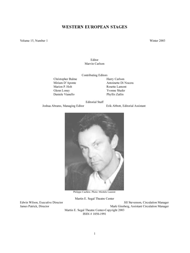 ERIK ABBOTT is a student in the Ph.D. in Theatre Program at the City University of New York Graduate Center and the Editorial Assistant for Western European Stages. CELIA BRAXTON is a doctoral student at the CUNY Graduate Center. Her paper, Walking the Plank: Virtual Reality in the Corral del Prncipe and The Balconies of Madrid was presented at the second annual SCAENA Conference of Shakespeare and his Contemporaries in Performance. Her Report on the Status of Women Directors and Playwrights in the New York City Theater, prepared for the Theatre Program, New York State Council on the Arts (NYSCA), was fundamental to NYSCAs 2002 Report on the Status of Women. Celia teaches in the Department of Theatre at Brooklyn College. MARVIN CARLSON, Sidney C. Cohn Professor of Theatre at the City University of New York Graduate Center, is the author of many articles on theatrical theory and European theatre history and dramatic literature. He is the 1994 recipient of the George Jean Nathan Award for dramatic criticism and the 1999 recipient of the American Society for Theatre Research Distinguished Scholar Award. His book, The Haunted Stage: The Theatre as Memory Machine, which came out from University of Michigan Press in 2001, received the Callaway Prize. BARRY DANIELS is a retired professor of Theatre History. He has written extensively on the French Romantic Theatre and his book Vers une scographie moderne: Dcors de la Comdie-Franaise, 1799-1848, will be published in 2003 by the Bibliothque nationale de France. JEAN DeCOCK is a Professor of French Literature with a PhD from UCLA, where he wrote his thesis on Michel de Ghelderode. After teaching at UCLA, UCBerkeley and UNLV, he is now retired between Paris and New York. He was Editor for the French Review on African Literature and Film for many years. MARIA M. DELGADO is Reader in Drama and Theatre Arts at Queen Mary, University of London and co-editor of Contemporary Theatre Review. Her most recent publications include the two co-edited volumes, The Paris Jigsaw: Internationalism and the Citys Stages and Theatre in Crisis: Performance Manifestos for a New Century (both Manchester University Press, 2002) and the forthcoming Other Spanish Theatres: Erasure and Inscription on the Twentieth Century Spanish Stage (Manchester University Press, 2003). GREG GIESEKAM is a Professor in the Department of Theatre, Film and Television Studies at the University of Glasgow. His publications include Community Theatre in Strathclyde and Luvvies and Rude Mechanicals? and he has also published on Sophocles, Pinter, Osborne, and Peter Arnott, and companies such as the Wooster Group, Clanjamfrie, and the Citizens Theatre, and created an annotated web-based Catalogue of the Archive of the National Review of Live Art, providing descriptive accounts of over 200 live art events between 1988 and 1996. MANUEL GARCA MARTNEZ received his doctorate from the Universit de Paris VII and is on the faculty at the Universidad de Santiago de Compostela, Spain. He has translated Tadeusz Kowzans Littrature et Spectacle into Spanish and derved as stagiare for Lavellis Le Public and Mesguichs Marie Tudor. BRUCE KIRLE is Associate Professor of Theatre at Roosevelt University, where he teaches graduate theatre history and directs the B.F.A. and M.F.A. Musical Theatre Programs. OLIVER NEVEUX teaches in the Department of Theatre Studies at the Universit de Paris XNanterre, and is writing a doctoral thesis on engaged aesthetics and theatre in France during the 1960s and 1970s. SOPHIE PROUST received her doctorate from Universit de Paris VIII on the direction of actors. She has contributed to a variety of theatrical journals. She has also served as an assistant director to Denis Marleau, Matthias Langhoff, and Yves Beaunesne on productions at the Avignon Festival, in Montreal, and in Italy.