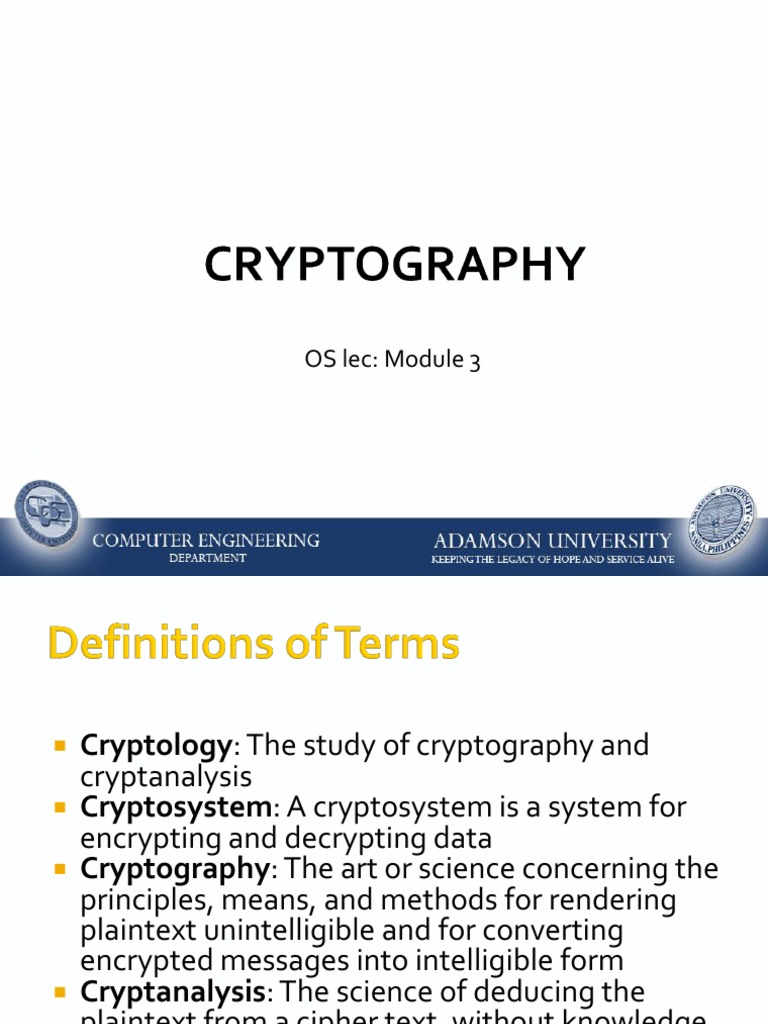 Cryptology: The study of cryptography and cryptanalysis Cryptosystem: A cryptosystem is a system for encrypting and decrypting data Cryptography: The art or science concerning the principles, means, and methods for rendering plaintext unintelligible and for converting encrypted messages into intelligible form Cryptanalysis: The science of deducing the plaintext from a cipher text, without knowledge of the key