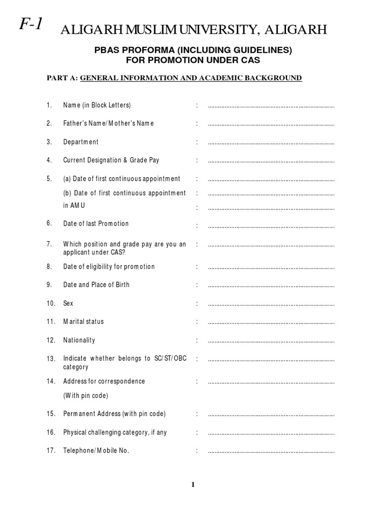 PBAS PROFORMA (INCLUDING GUIDELINES) FOR PROMOTION UNDER CAS