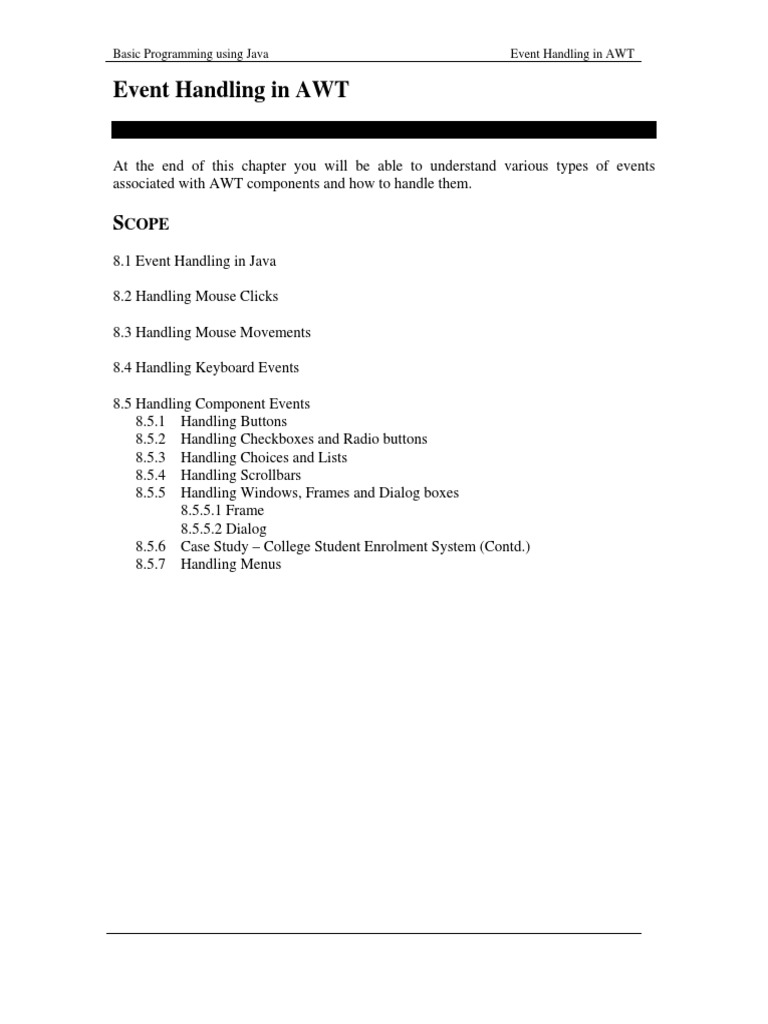 8.1 Event Handling in Java 8.2 Handling Mouse Clicks 8.3 Handling Mouse Movements 8.4 Handling Keyboard Events 8.5 Handling Component Events 8.5.1 Handling Buttons 8.5.2 Handling Checkboxes and Radio buttons 8.5.3 Handling Choices and Lists 8.5.4 Handling Scrollbars 8.5.5 Handling Windows, Frames and Dialog boxes 8.5.5.1 Frame 8.5.5.2 Dialog 8.5.6 Case Study College Student Enrolment System (Contd.) 8.5.7 Handling Menus