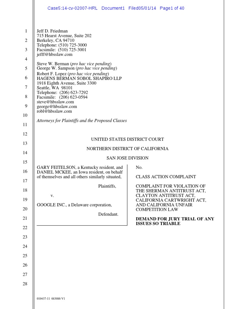 Class action lawsuit filed May 1, 2014, accuses Google of maintaining an illegal monopoly that stagnated Internet and mobile search.