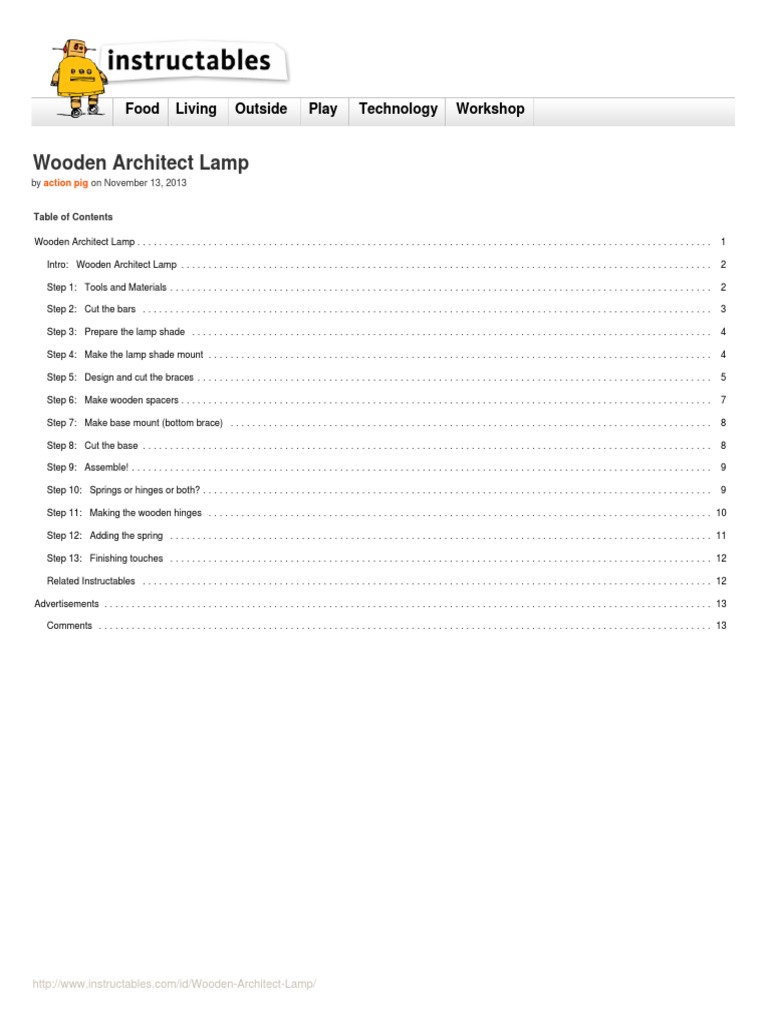 by action pig on November 13, 2013 Table of Contents Wooden Architect Lamp . . . . . . . . . . . . . . . . . . . . . . . . . . . . . . . . . . . . . . . . . . . . . . . . . . . . . . . . . . . . . . . . . . . . . . . . . . . . . . . . . . . . . . . . . . . . . . . . . . . . . . . . . Intro: Wooden Architect Lamp . . . . . . . . . . . . . . . . . . . . . . . . . . . . . . . . . . . . . . . . . . . . . . . . . . . . . . . . . . . . . . . . . . . . . . . . . . . . . . . . . . . . . . . . . . . . . . . . . Step 1: Tools and Materials . . . . . . . . . . . . . . . . . . . . . . . . . . . . . . . . . . . . . . . . . . . . . . . . . . . . . . . . . . . . . . . . . . . . . . . . . . . . . . . . . . . . . . . . . . . . . . . . . . . Step 2: Cut the bars . . . . . . . . . . . . . . . . . . . . . . . . . . . . . . . . . . . . . . . . . . . . . . . . . . . . . . . . . . . . . . . . . . . . . . . . . . . . . . . . . . . . . . . . . . . . . . . . . . . . . . . . Step 3: Prepare the lamp shade . . . . . . . . . . . . . . . . . . . . . . . . . . . . . . . . . . . . . . . . . . . . . . . . . . . . . . . . . . . . . . . . . . . . . . . . . . . . . . . . . . . . . . . . . . . . . . . Step 4: Make the lamp shade mount . . . . . . . . . . . . . . . . . . . . . . . . . . . . . . . . . . . . . . . . . . . . . . . . . . . . . . . . . . . . . . . . . . . . . . . . . . . . . . . . . . . . . . . . . . . . Step 5: Design and cut the braces . . . . . . . . . . . . . . . . . . . . . . . . . . . . . . . . . . . . . . . . . . . . . . . . . . . . . . . . . . . . . . . . . . . . . . . . . . . . . . . . . . . . . . . . . . . . . . Step 6: Make wooden spacers . . . . . . . . . . . . . . . . . . . . . . . . . . . . . . . . . . . . . . . . . . . . . . . . . . . . . . . . . . . . . . . . . . . . . . . . . . . . . . . . . . . . . . . . . . . . . . . . . Step 7: Make base mount (bottom brace) . . . . . . . . . . . . . . . . . . . . . . . . . . . . . . . . . . . . . . . . . . . . . . . . . . . . . . . . . . . . . . . . . . . . . . . . . . . . . . . . . . . . . . . . Step 8: Cut the base . . . . . . . . . . . . . . . . . . . . . . . . . . . . . . . . . . . . . . . . . . . . . . . . . . . . . . . . . . . . . . . . . . . . . . . . . . . . . . . . . . . . . . . . . . . . . . . . . . . . . . . . Step 9: Assemble! . . . . . . . . . . . . . . . . . . . . . . . . . . . . . . . . . . . . . . . . . . . . . . . . . . . . . . . . . . . . . . . . . . . . . . . . . . . . . . . . . . . . . . . . . . . . . . . . . . . . . . . . . . Step 10: Springs or hinges or both? . . . . . . . . . . . . . . . . . . . . . . . . . . . . . . . . . . . . . . . . . . . . . . . . . . . . . . . . . . . . . . . . . . . . . . . . . . . . . . . . . . . . . . . . . . . . . 1 2 2 3 4 4 5 7 8 8 9 9