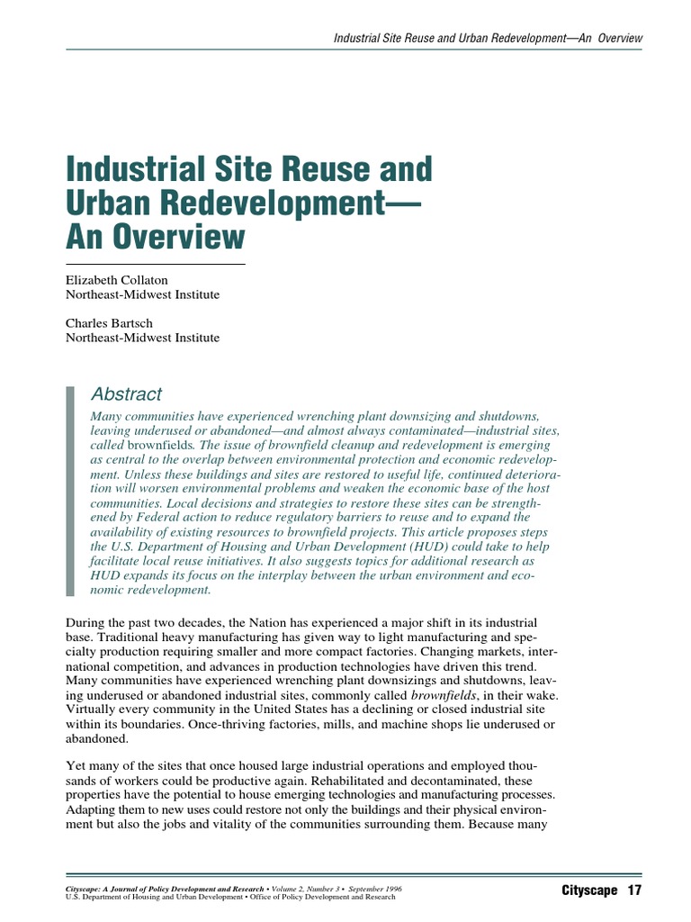 Elizabeth Collaton is senior policy analyst for pollution prevention and waste reduction for the Northeast-Midwest Institute. She focuses on environmental aspects of industrial site reuse, including cleanup standards and land use decisions related to brownfields redevelopment. Charles Bartsch is senior policy analyst for economic development at the NortheastMidwest Institute, specializing in industrial site reuse, Federal and State financial assistance, and manufacturing modernization issues.