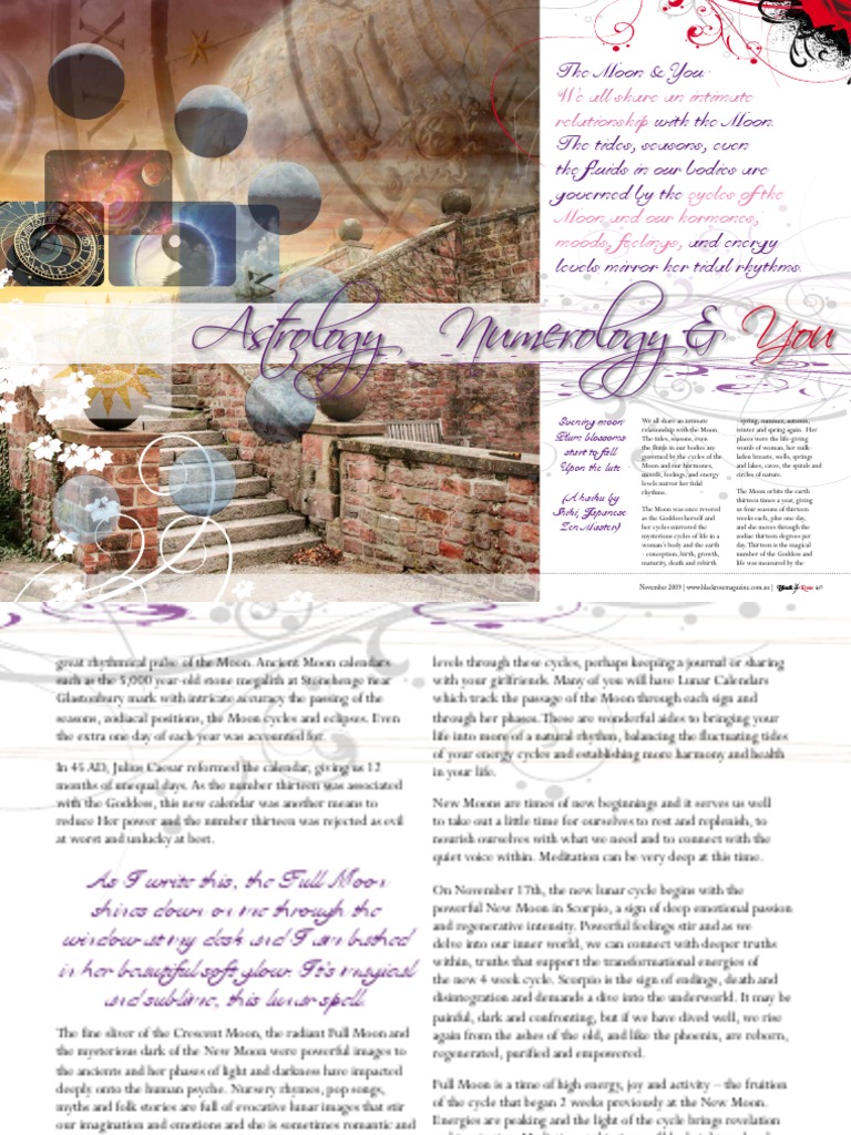levels through these cycles, perhaps keeping a journal or sharing with your girlfriends. Many of you will have Lunar Calendars which track the passage of the Moon through each sign and through her phases. These are wonderful aides to bringing your life into more of a natural rhythm, balancing the fluctuating tides of your energy cycles and establishing more harmony and health in your life. New Moons are times of new beginnings and it serves us well to take out a little time for ourselves to rest and replenish, to nourish ourselves with what we need and to connect with the quiet voice within. Meditation can be very deep at this time. On November 17th, the new lunar cycle begins with the powerful New Moon in Scorpio, a sign of deep emotional passion and regenerative intensity. Powerful feelings stir and as we delve into our inner world, we can connect with deeper truths within, truths that support the transformational energies of the new 4 week cycle. Scorpio is the sign of endings, death and disintegration and demands a dive into the underworld. It may be painful, dark and confronting, but if we have dived well, we rise again from the ashes of the old, and like the phoenix, are reborn, regenerated, purified and empowered. Full Moon is a time of high energy, joy and activity the fruition of the cycle that began 2 weeks previously at the New Moon. Energies are peaking and the light of the cycle brings revelation and inspiration. Mediation at this time will be heightened and ecstatic. In subsequent Moon and You articles, well explore more of the mythology of the Moon and the Moons phases. Well also investigate the many ways of working with the Moon, such as in medical astrology, fertility, lunar planting, food issues and the meanings of the Moon in the different astrological signs. Where is the Moon in your Birthchart?