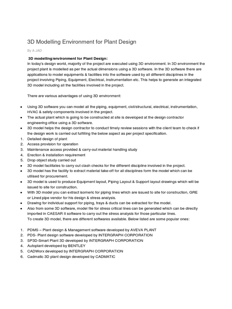 3D modelling/environment for Plant Design: