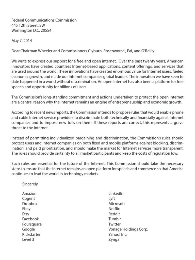 Net Neutrality Company Sign on Letter
