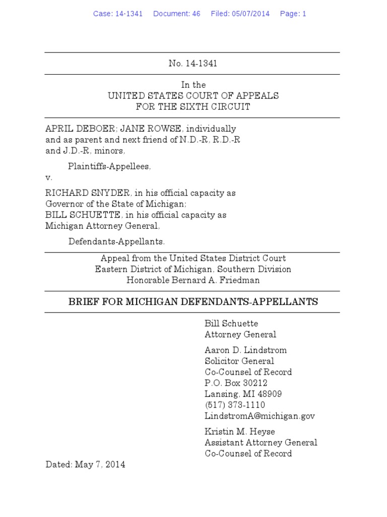No. 14-1341 In the UNITED STATES COURT OF APPEALS FOR THE SIXTH CIRCUIT APRIL DEBOER; JANE ROWSE, individually and as parent and next friend of N.D.-R, R.D.-R and J.D.-R, minors, Plaintiffs-Appellees, v. RICHARD SNYDER, in his official capacity as Governor of the State of Michigan; BILL SCHUETTE, in his official capacity as Michigan Attorney General, Defendants-Appellants. Appeal from the United States District Court Eastern District of Michigan, Southern Division Honorable Bernard A. Friedman