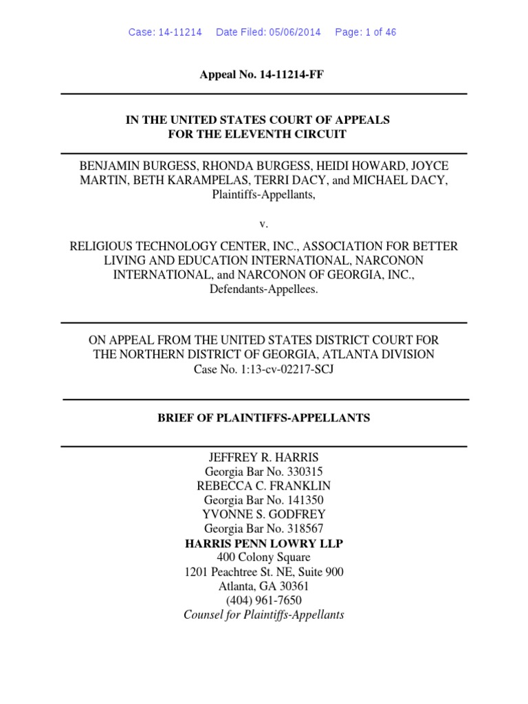 BENJAMIN BURGESS, RHONDA BURGESS, HEIDI HOWARD, JOYCE MARTIN, BETH KARAMPELAS, TERRI DACY, and MICHAEL DACY, Plaintiffs-Appellants, v. RELIGIOUS TECHNOLOGY CENTER, INC., ASSOCIATION FOR BETTER LIVING AND EDUCATION INTERNATIONAL, NARCONON INTERNATIONAL, and NARCONON OF GEORGIA, INC., Defendants-Appellees. ON APPEAL FROM THE UNITED STATES DISTRICT COURT FOR THE NORTHERN DISTRICT OF GEORGIA, ATLANTA DIVISION Case No. 1:13-cv-02217-SCJ