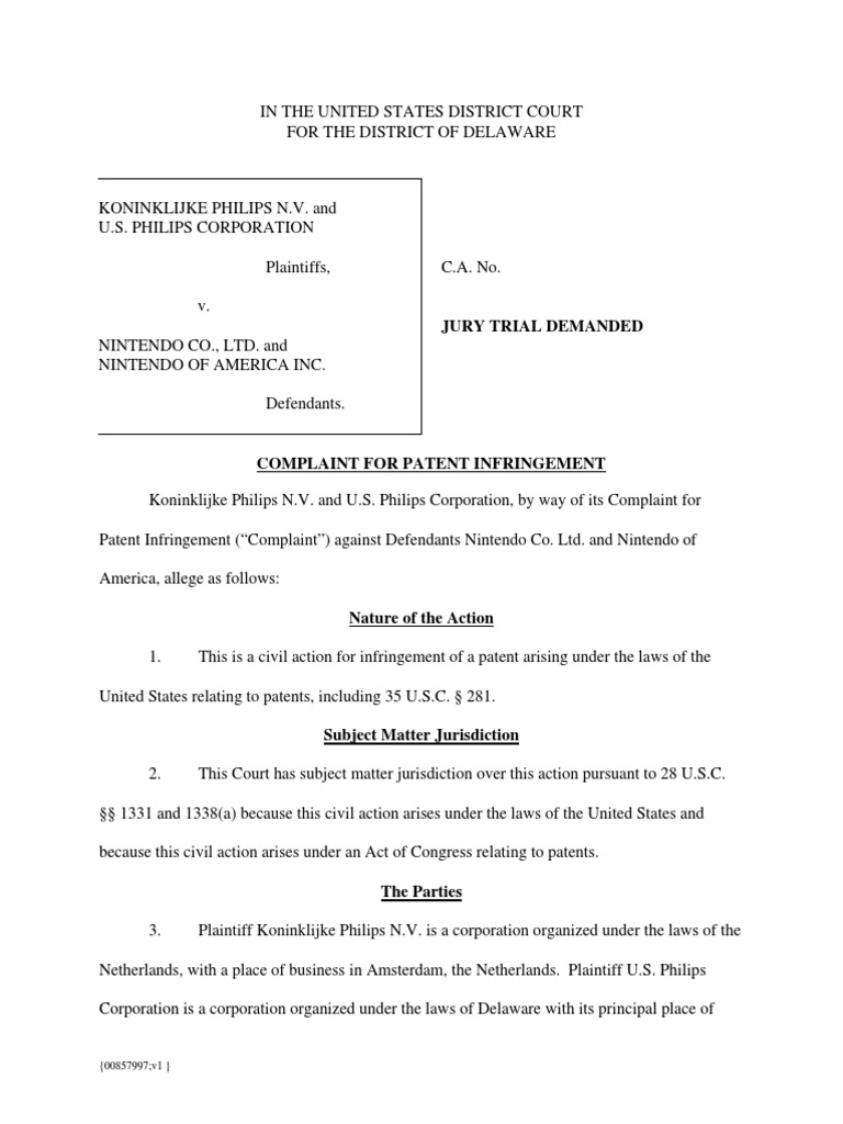 Koninklijke Philips N.V. and U.S. Philips Corporation, by way of its Complaint for Patent Infringement (“Complaint”) against Defendants Nintendo Co. Ltd. and Nintendo of America, allege as follows: