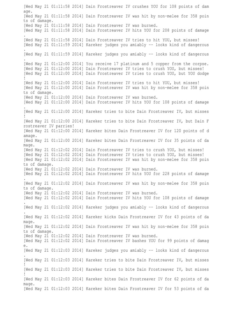 [Wed May 21 01:18:33 2014] Dain Frostreaver IV hits YOU for 108 points of damage