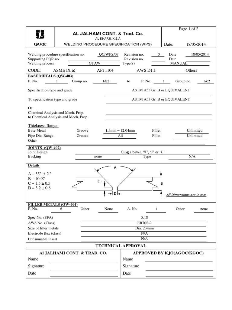 Welding procedure specification no. QC/WPS/07 Revision no. 0 Date 18/05/2014