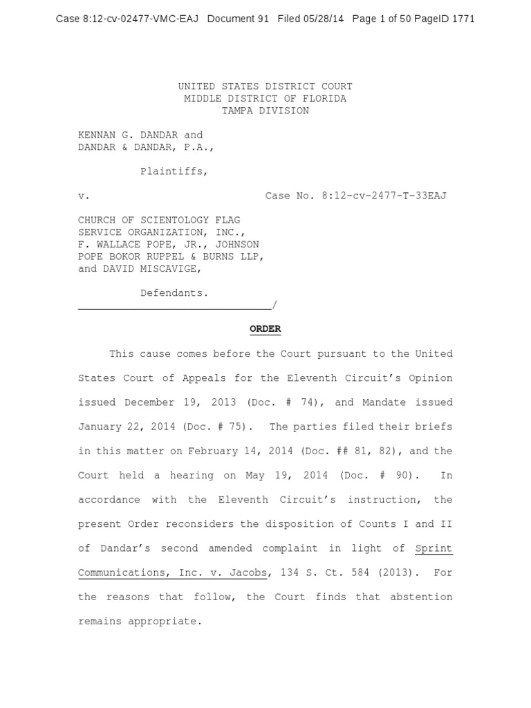 UNITED STATES DISTRICT COURT MIDDLE DISTRICT OF FLORIDA TAMPA DIVISION KENNAN G. DANDAR and DANDAR & DANDAR, P.A., Plaintiffs, v. Case No. 8:12-cv-2477-T-33EAJ CHURCH OF SCIENTOLOGY FLAG SERVICE ORGANIZATION, INC., F. WALLACE POPE, JR., JOHNSON POPE BOKOR RUPPEL & BURNS LLP, and DAVID MISCAVIGE, Defendants. _______________________________/
