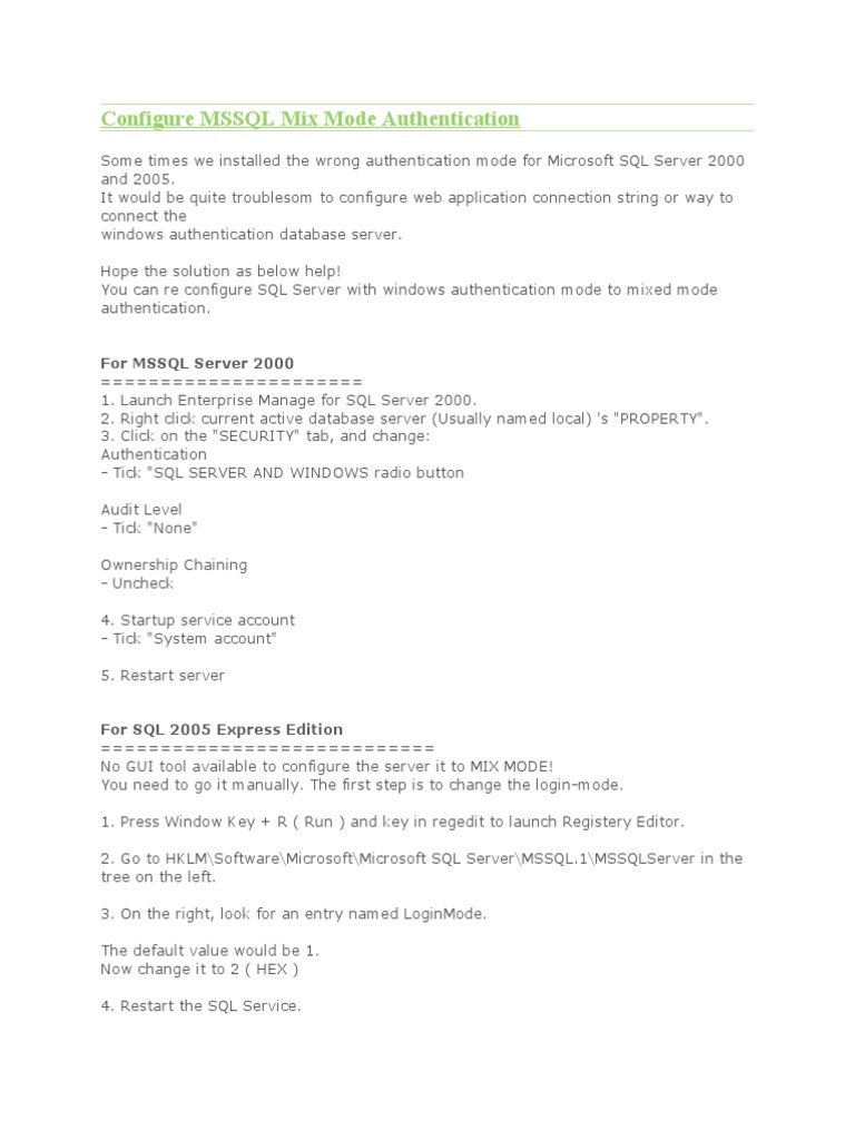 Note Before you switch authentication modes, you must set a sa password to avoid