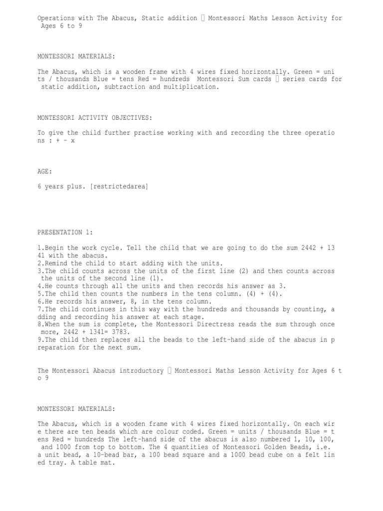 Operations with The Abacus, Static addition Montessori Maths Lesson Activity for