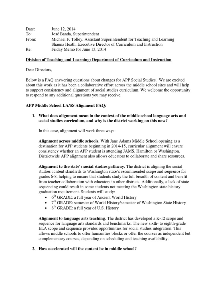Below is a FAQ answering questions about changes for APP Social Studies. We are excited about this work as it has been a collaborative effort across the middle school sites and will help to support consistency and alignment of social studies curriculum. We welcome the opportunity to respond to any additional questions you may receive.