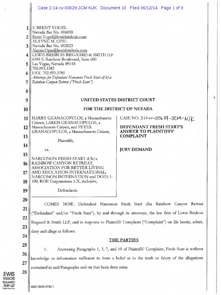 GEANACOPULOS v. NARCONON: Defendant Answer