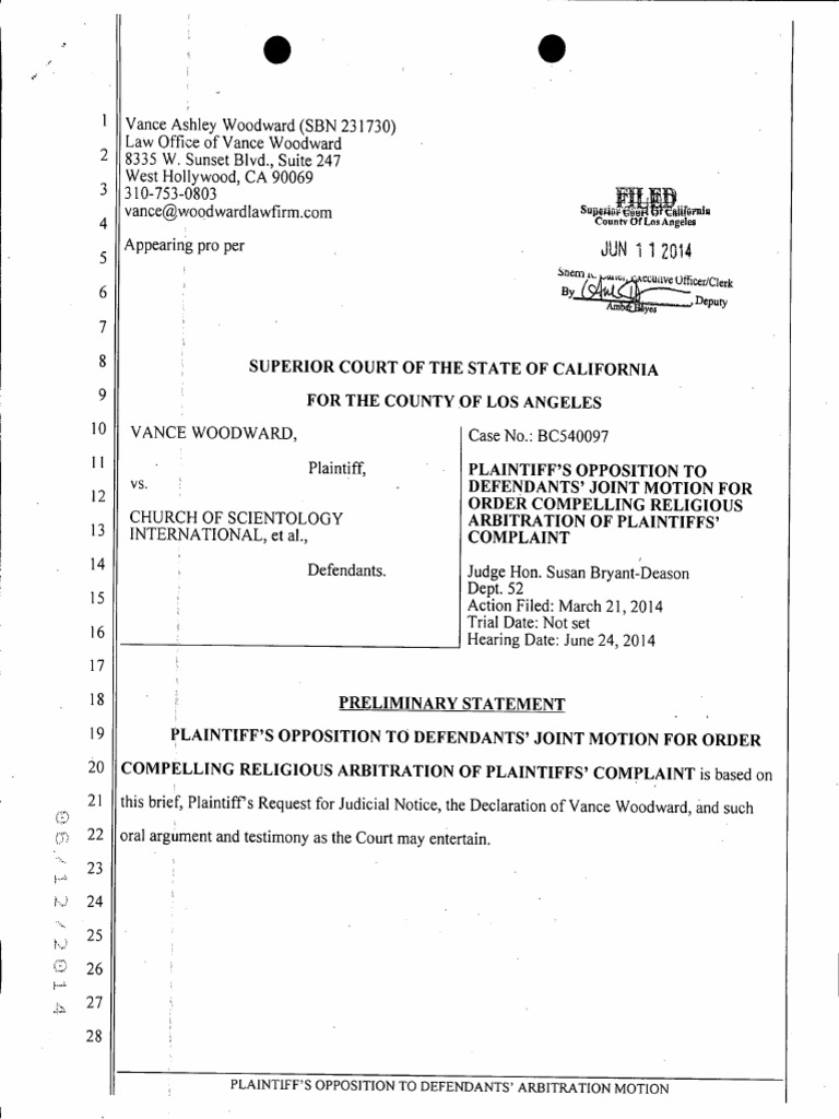 Woodward v. Scientology: Plaintiff Opposition To Motion To Compel Arbitration