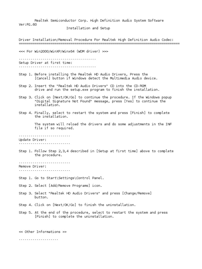 Realtek Semiconductor Corp. High Definition Audio System Software Ver:R1.60 Installation