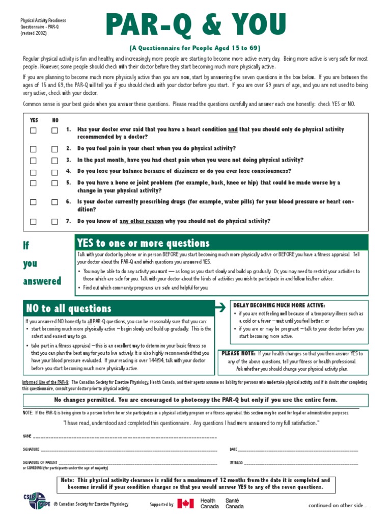 Informed Use of the PAR-Q: The Canadian Society for Exercise Physiology, Health Canada, and their agents assume no liability for persons who undertake physical activity, and if in doubt after completing