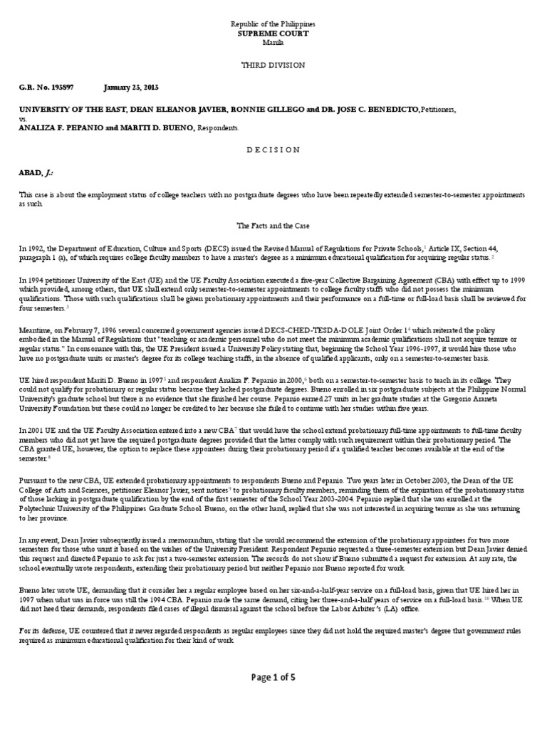 On March 10, 2005 the LA held that Bueno and Pepanio were regular employees, given that they taught at UE for at least four semesters under the old