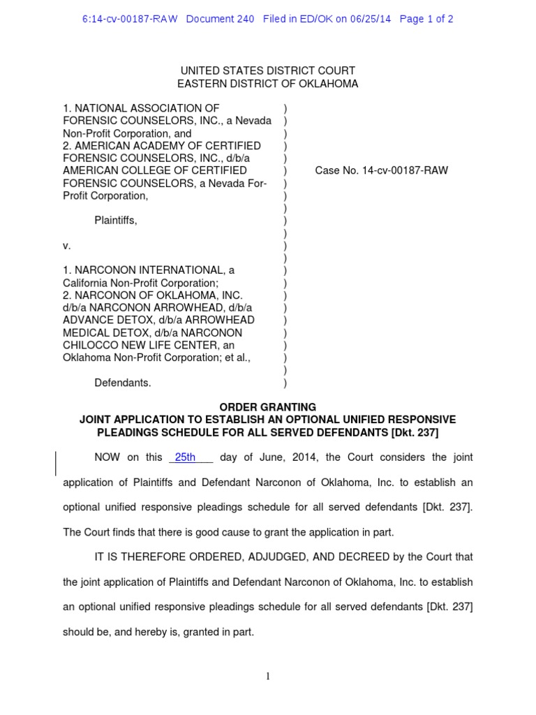 UNITED STATES DISTRICT COURT EASTERN DISTRICT OF OKLAHOMA 1. NATIONAL ASSOCIATION OF ) FORENSIC COUNSELORS, INC., a Nevada ) Non-Profit Corporation, and ) 2. AMERICAN ACADEMY OF CERTIFIED ) FORENSIC COUNSELORS, INC., d/b/a ) AMERICAN COLLEGE OF CERTIFIED ) Case No. 14-cv-00187-RAW FORENSIC COUNSELORS, a Nevada For- ) Profit Corporation, ) ) Plaintiffs, ) ) v. ) ) 1. NARCONON INTERNATIONAL, a ) California Non-Profit Corporation; ) 2. NARCONON OF OKLAHOMA, INC. ) d/b/a NARCONON ARROWHEAD, d/b/a ) ADVANCE DETOX, d/b/a ARROWHEAD ) MEDICAL DETOX, d/b/a NARCONON ) CHILOCCO NEW LIFE CENTER, an ) Oklahoma Non-Profit Corporation; et al., ) ) Defendants. )