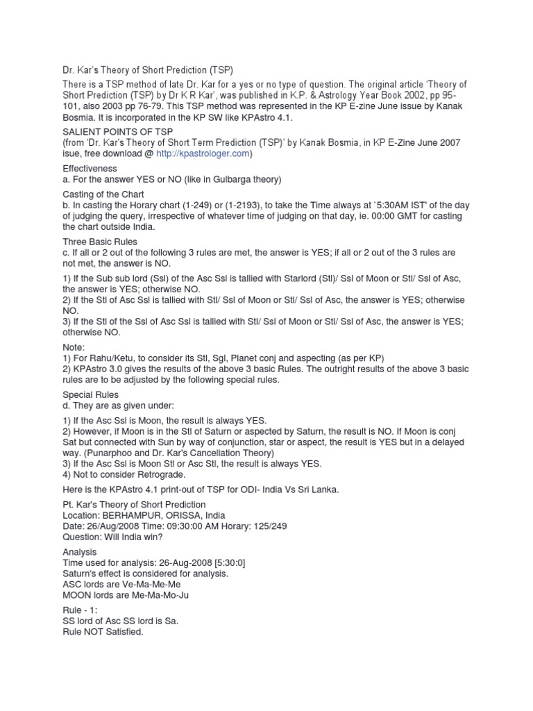 Short Prediction (TSP) by Dr K R Kar, was published in K.P. & Astrology Year Book 2002, pp 95-