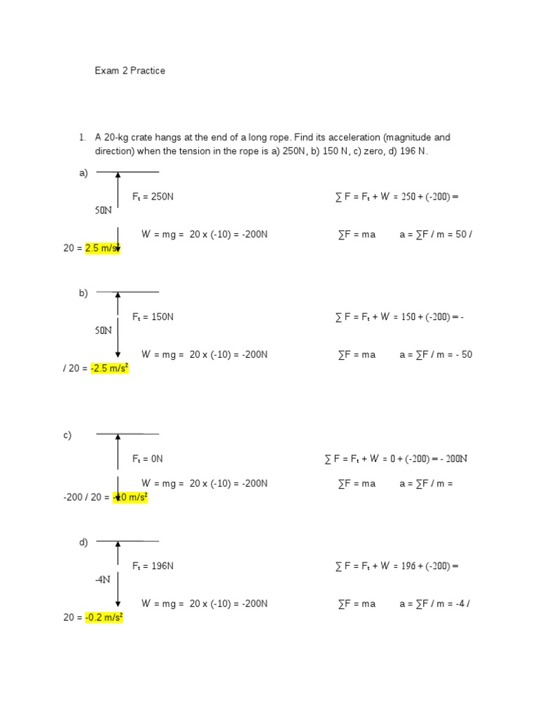 1. A 20-kg crate hangs at the end of a long rope. Find its acceleration (magnitude and
